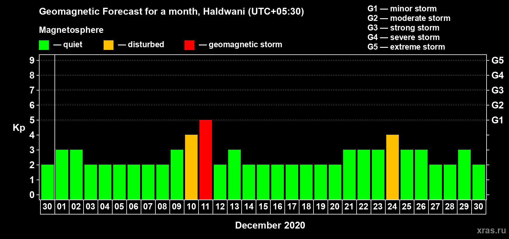 Geomagnetic storm forecast in Haldwani for Nov 30, 2020