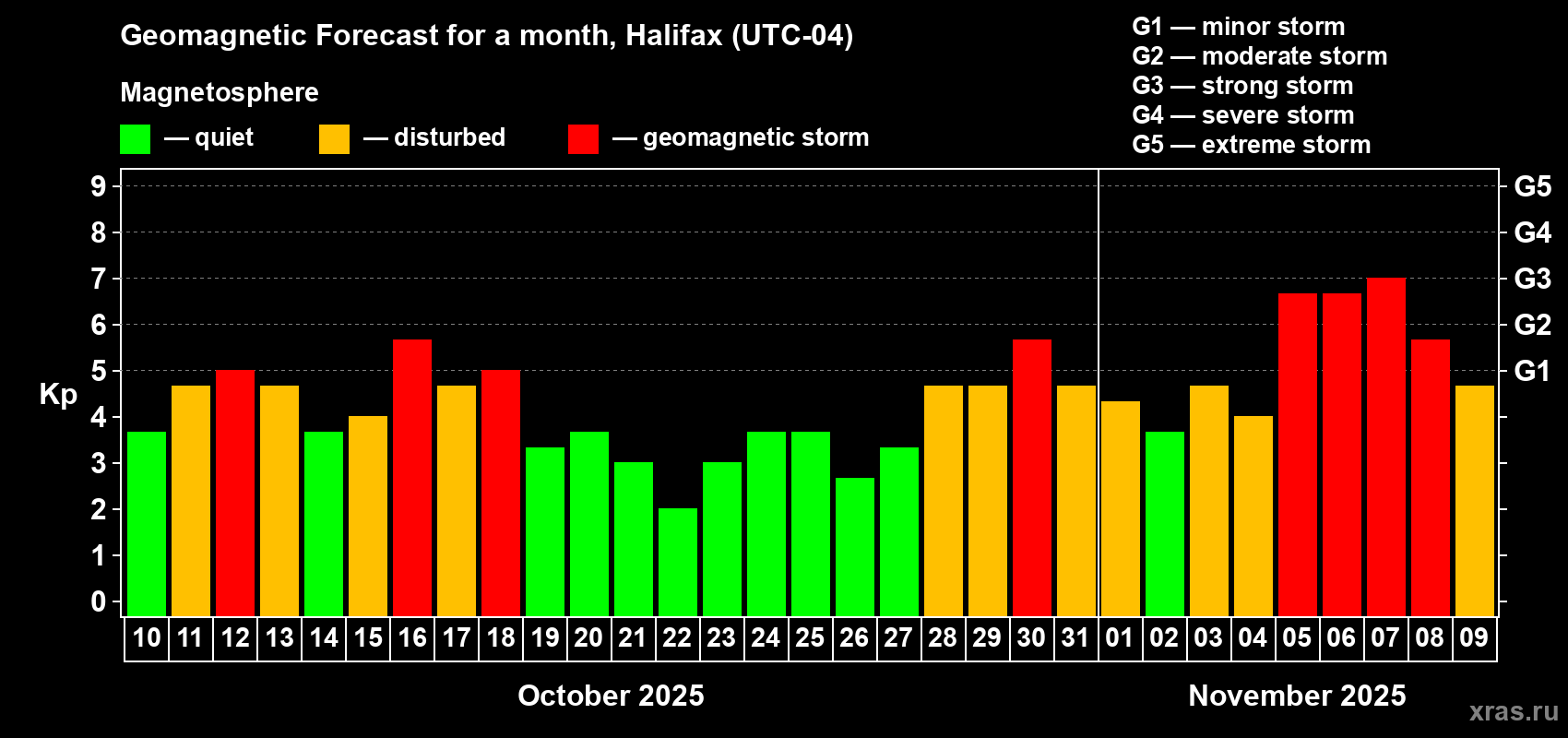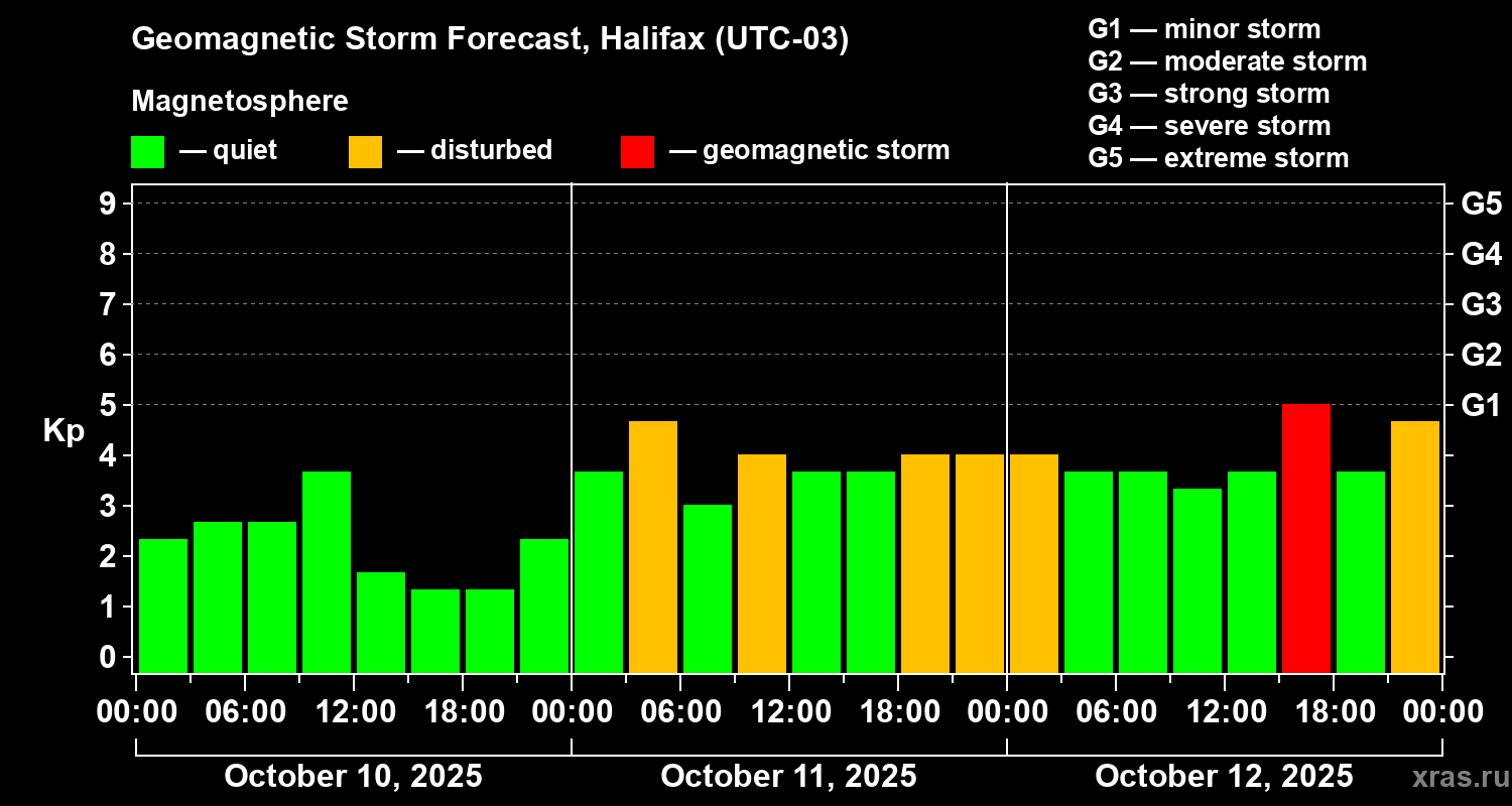Geomagnetic storm forecast in Halifax for Oct 10, 2025