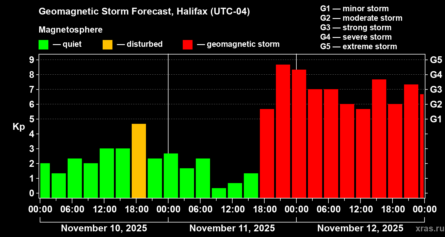 Geomagnetic storm forecast in Halifax for Nov 10, 2025
