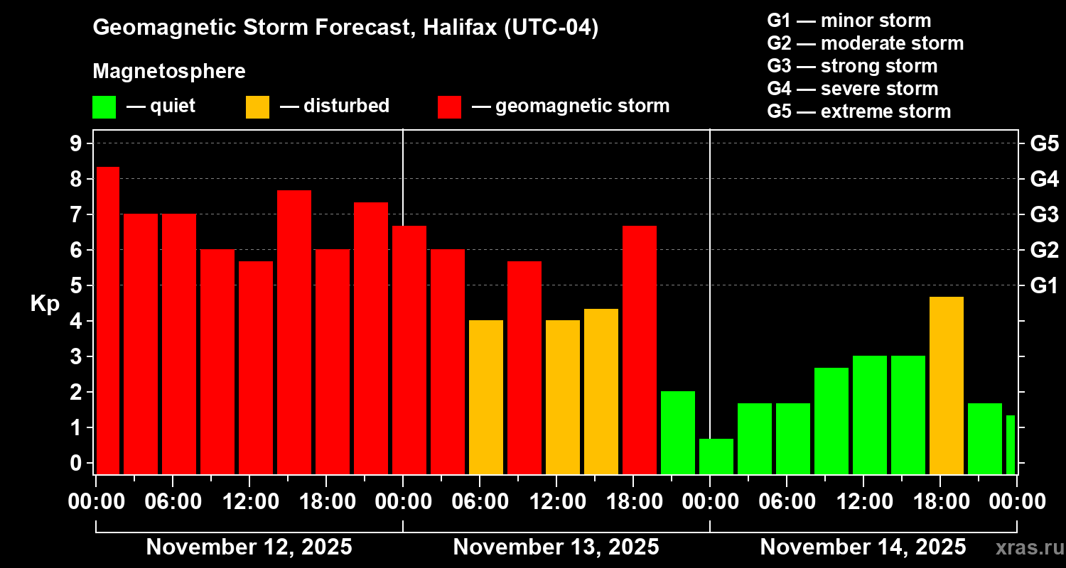 Geomagnetic storm forecast in Halifax for Nov 12, 2025