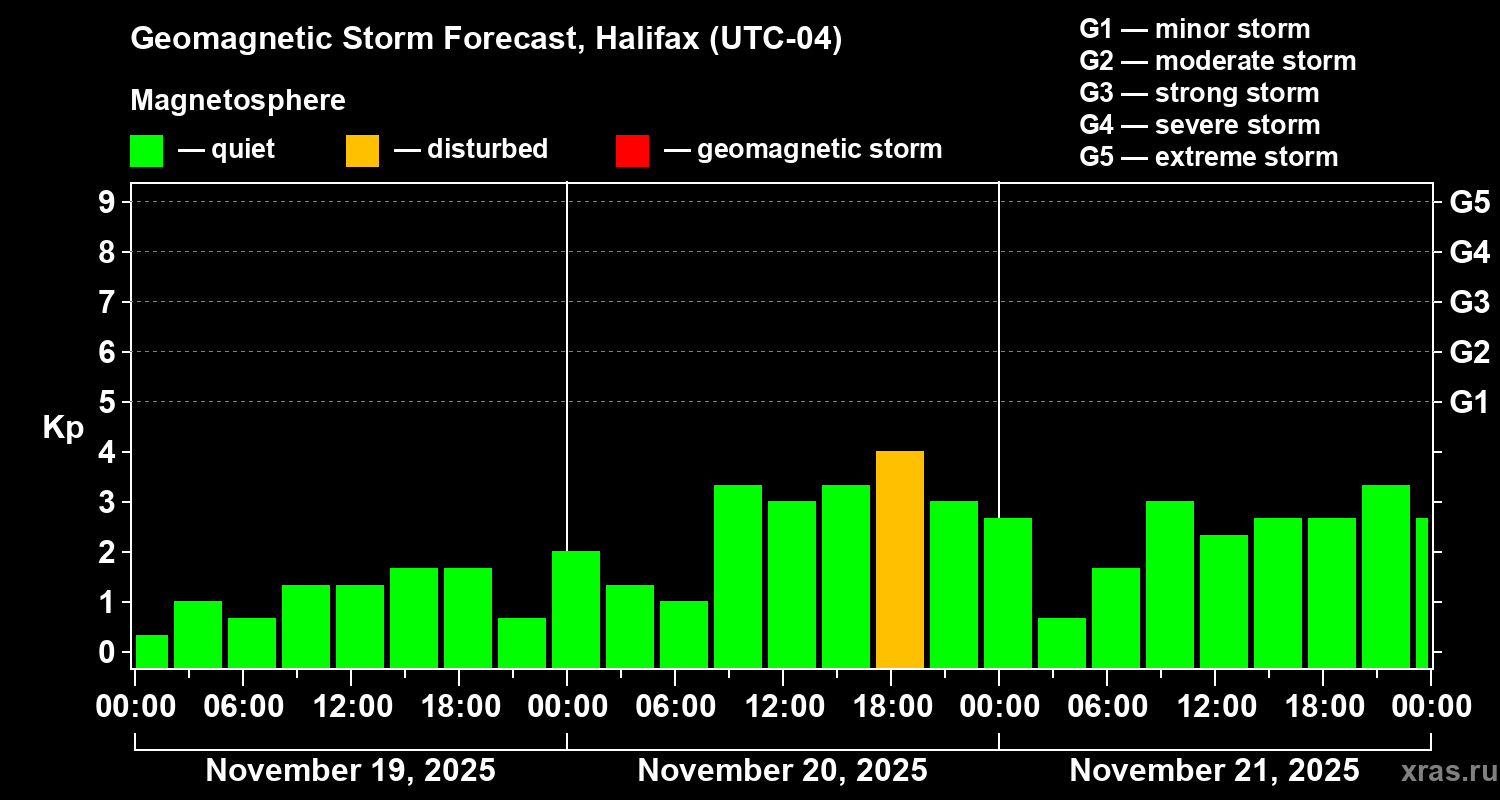 Geomagnetic storm forecast in Halifax for Nov 19, 2025