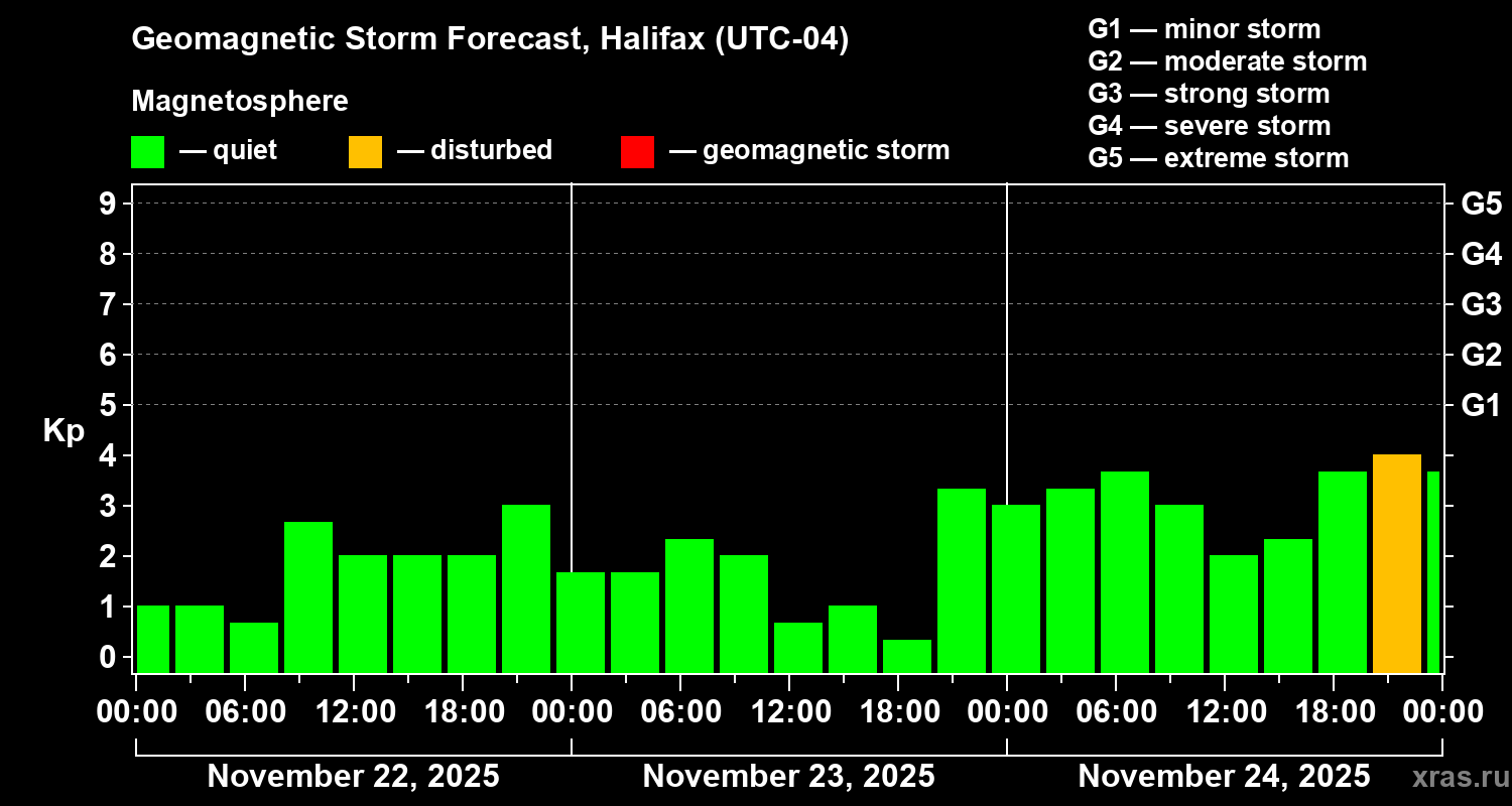 Geomagnetic storm forecast in Halifax for Nov 22, 2025