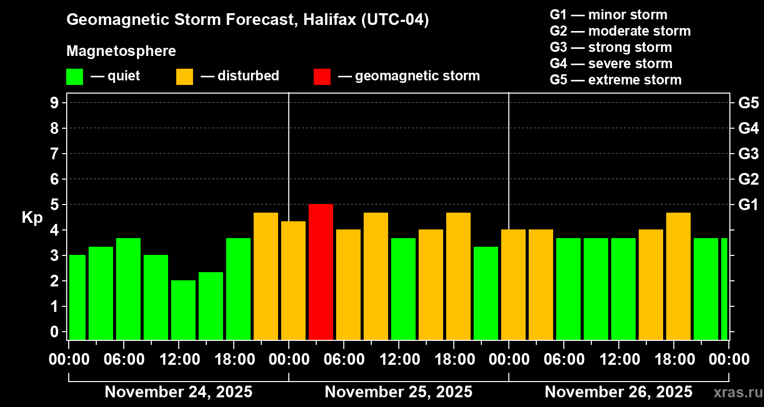 Geomagnetic storm forecast in Halifax for Nov 24, 2025