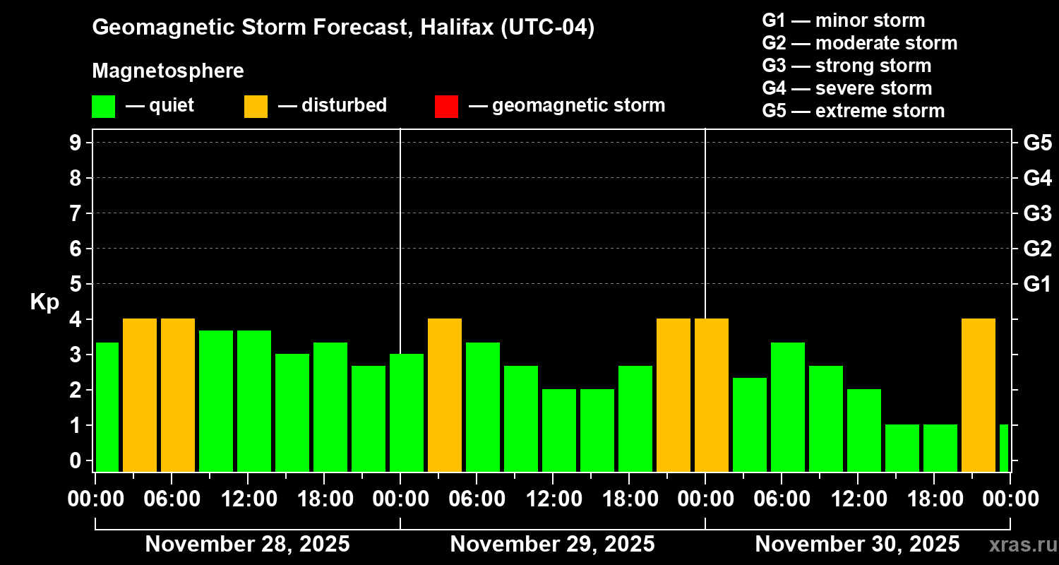 Geomagnetic storm forecast in Halifax for Nov 28, 2025