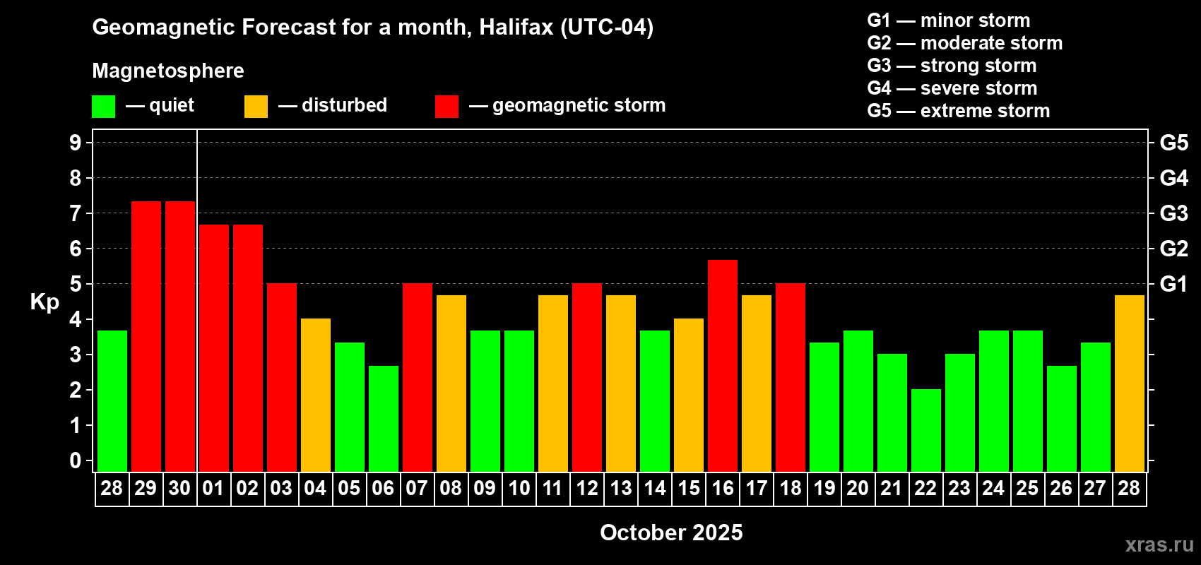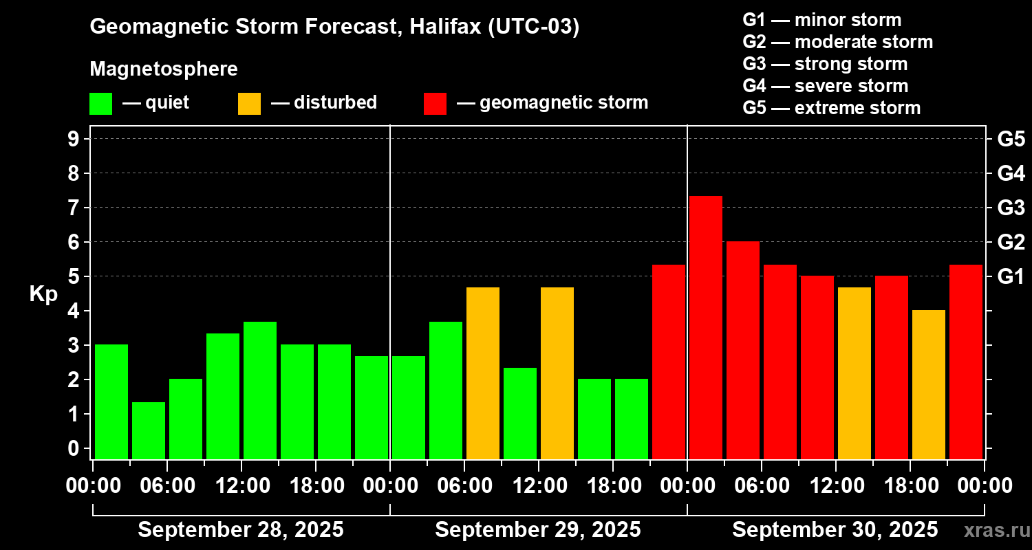 Geomagnetic storm forecast in Halifax for Sep 28, 2025