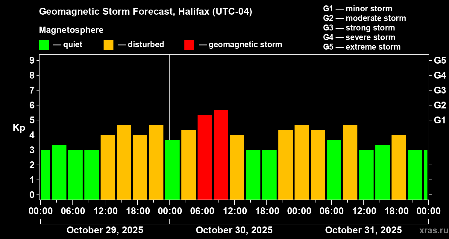 Geomagnetic storm forecast in Halifax for Oct 29, 2025