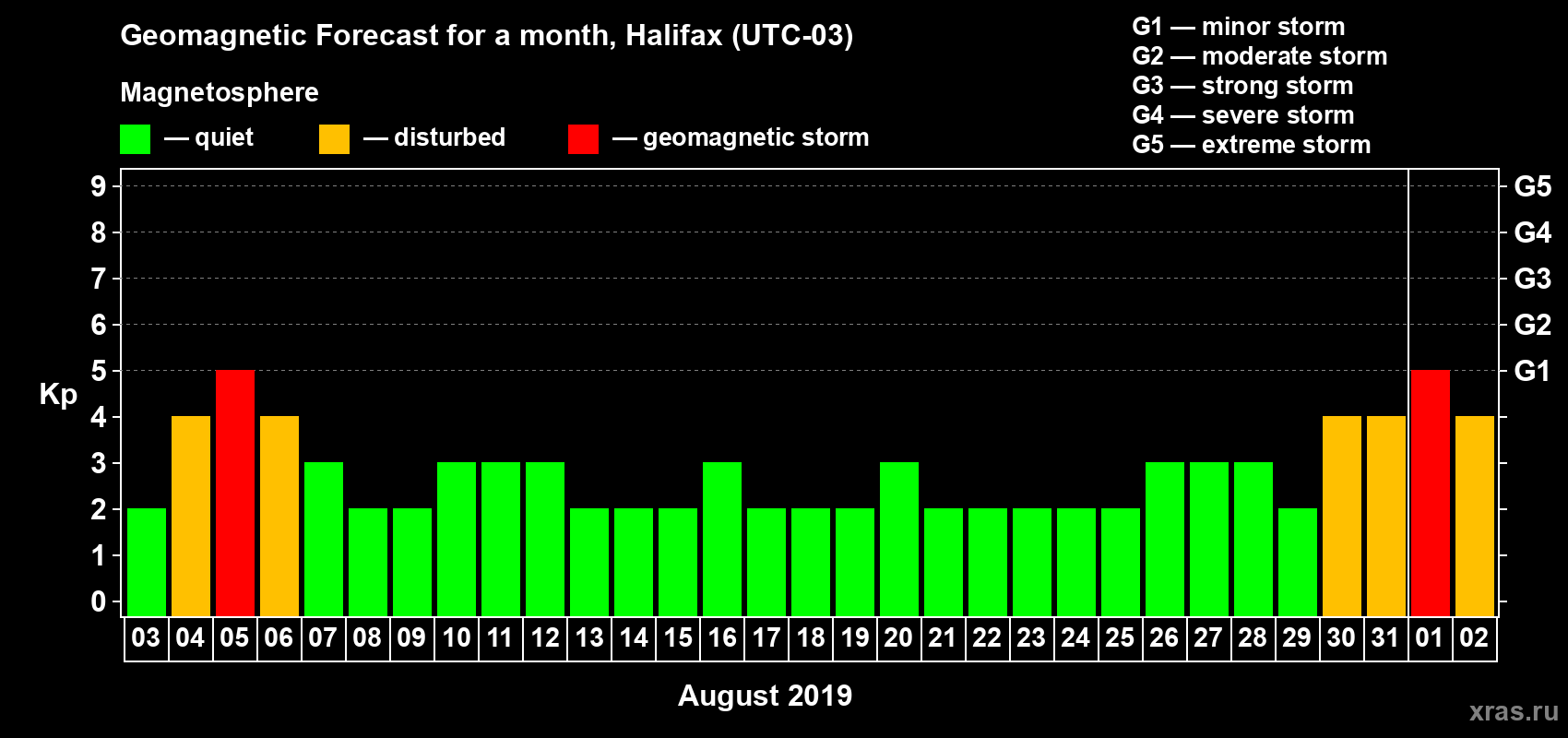Geomagnetic storm forecast in Halifax for Aug 03, 2019