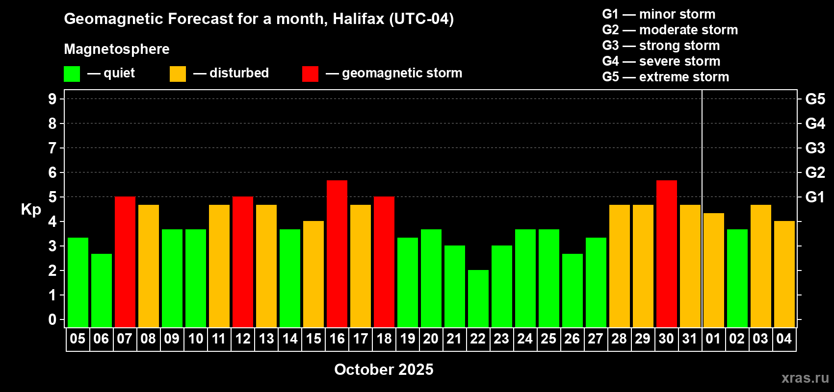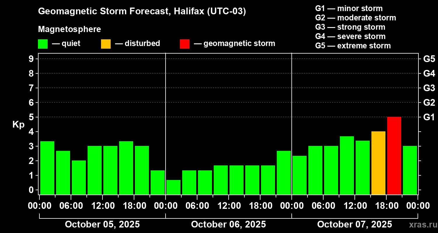 Geomagnetic storm forecast in Halifax for Oct 05, 2025