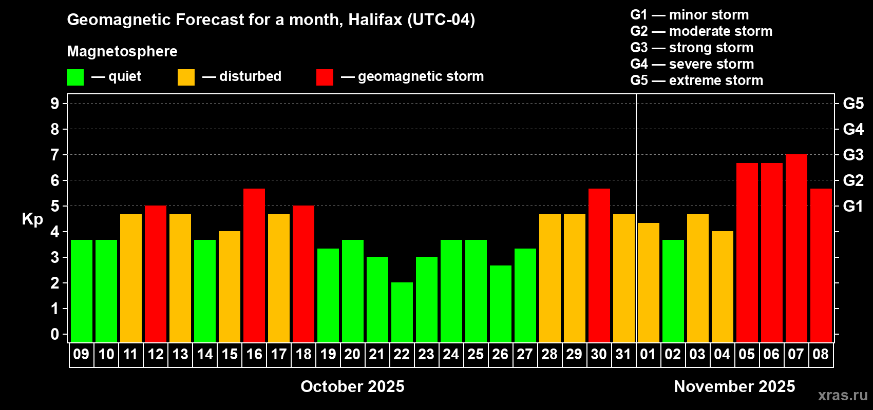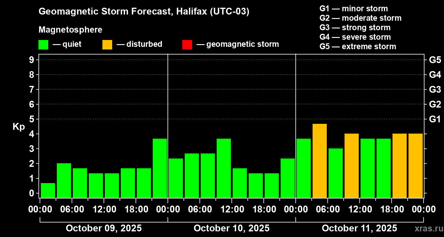 Geomagnetic storm forecast in Halifax for Oct 09, 2025