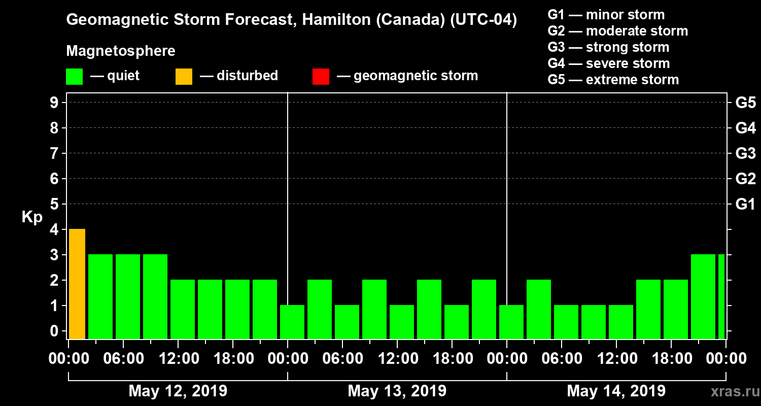 Geomagnetic storm forecast in Hamilton (Canada) for May 12, 2019