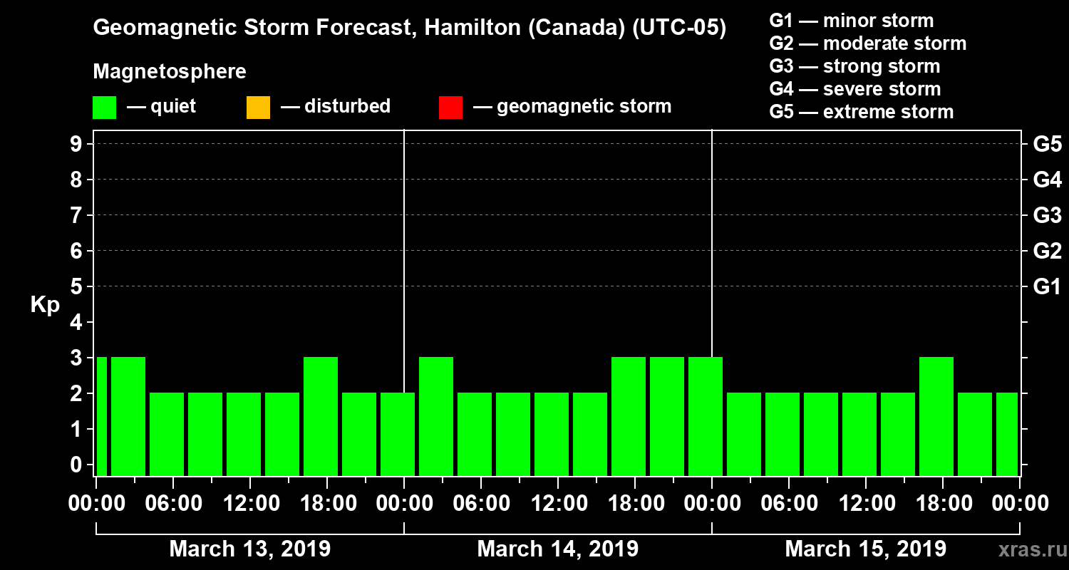 Geomagnetic storm forecast in Hamilton (Canada) for Mar 13, 2019