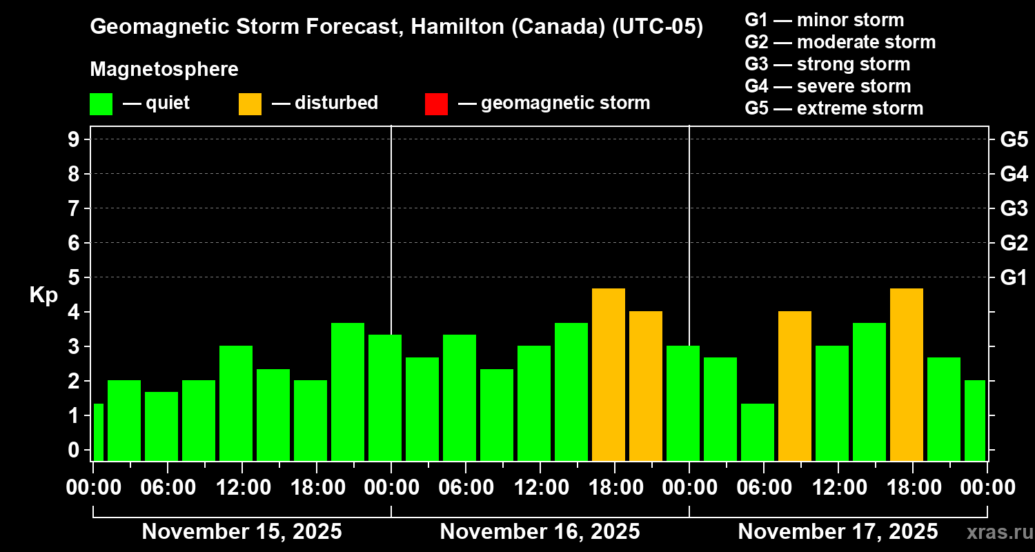 Geomagnetic storm forecast in Hamilton (Canada) for Nov 15, 2025