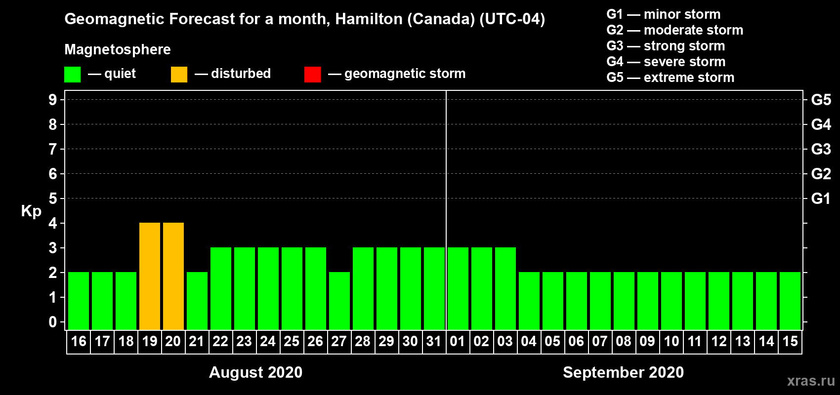 Geomagnetic storm forecast in Hamilton (Canada) for Aug 16, 2020