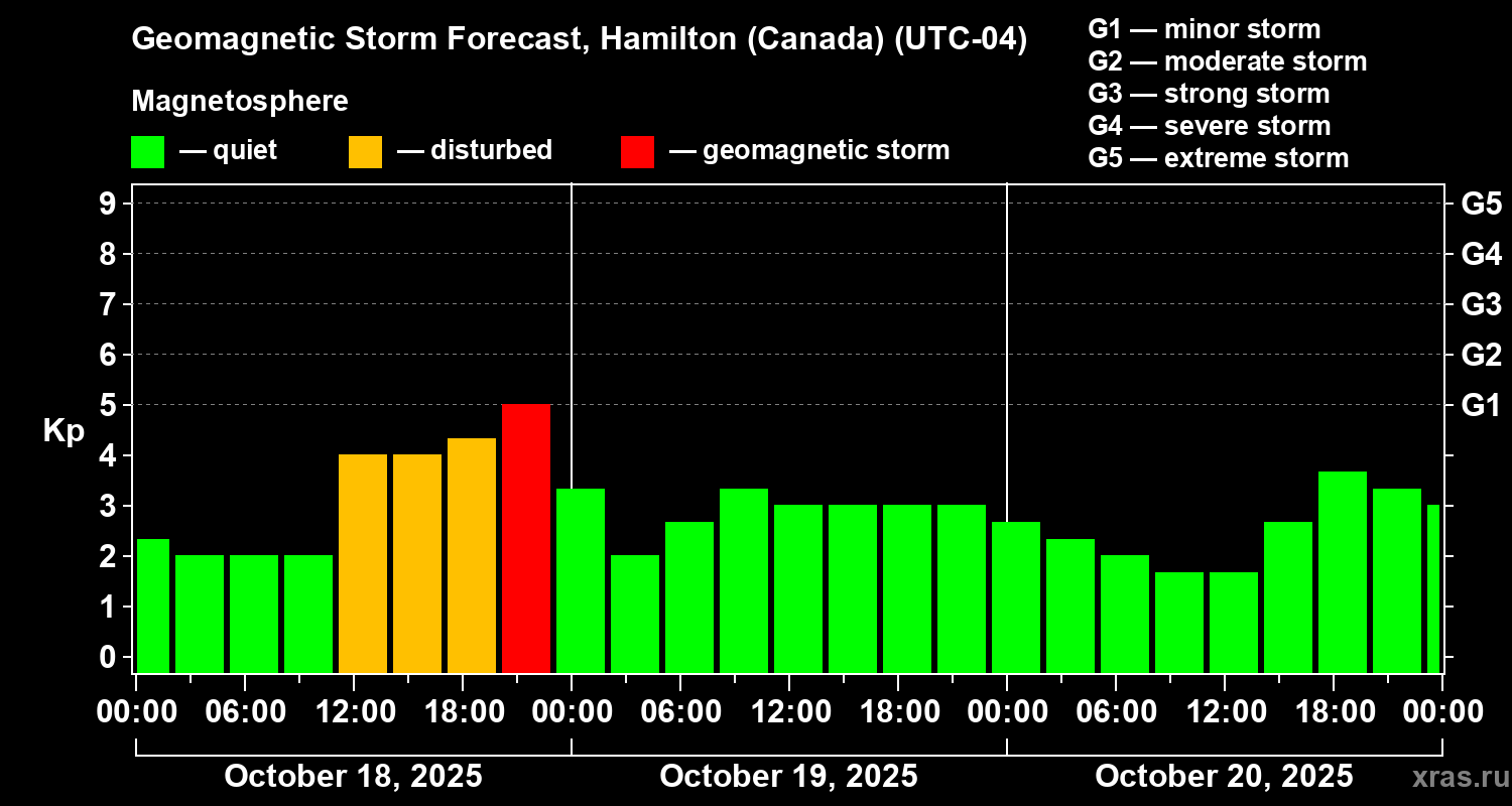 Geomagnetic storm forecast in Hamilton (Canada) for Oct 18, 2025
