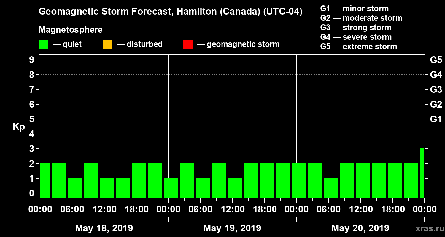 Geomagnetic storm forecast in Hamilton (Canada) for May 18, 2019