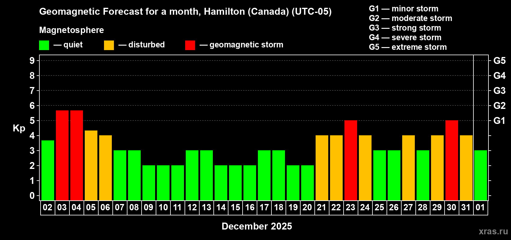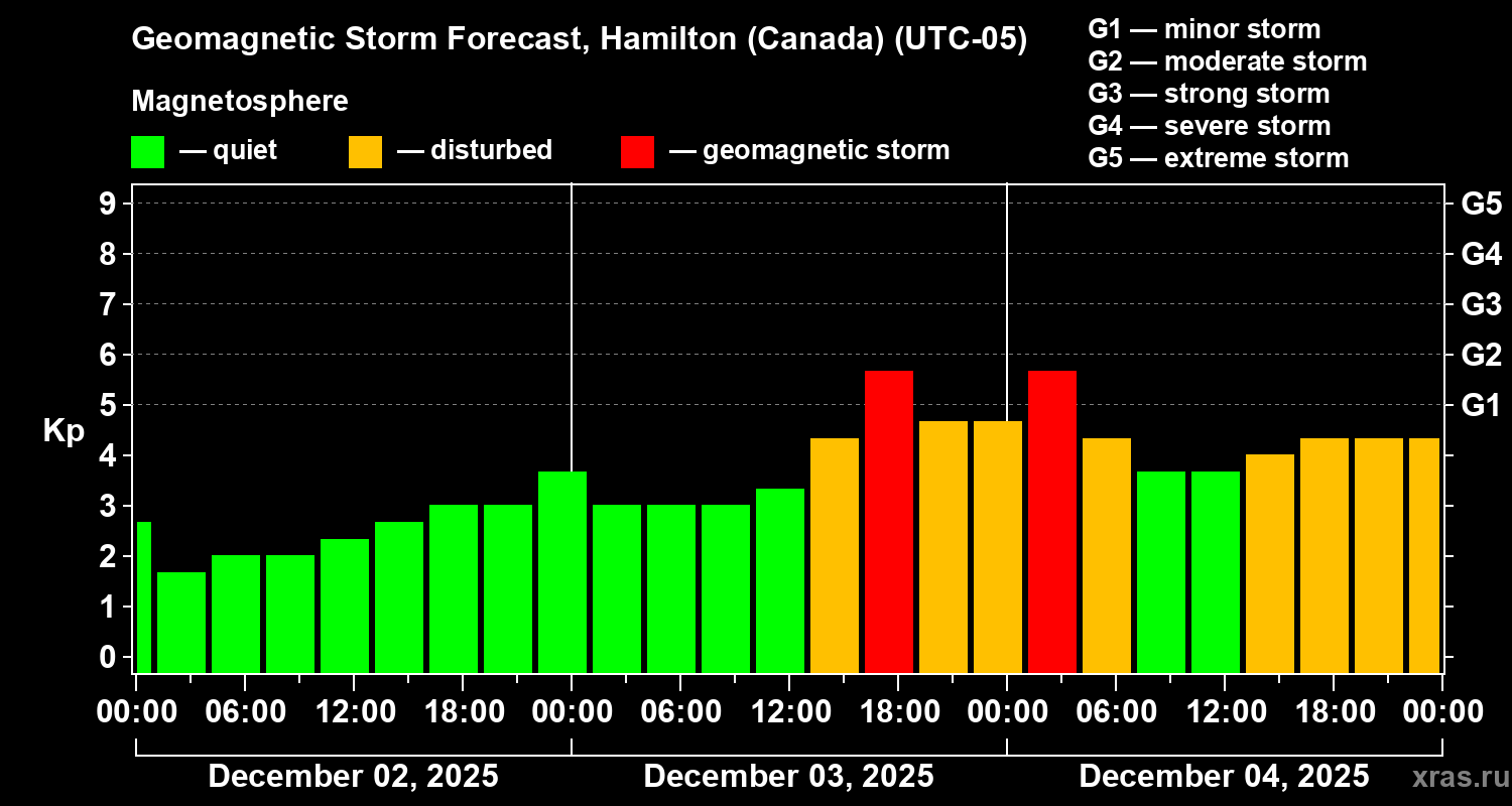 Geomagnetic storm forecast in Hamilton (Canada) for Dec 02, 2025