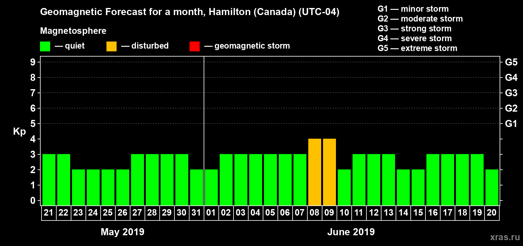 Geomagnetic storm forecast in Hamilton (Canada) for May 21, 2019