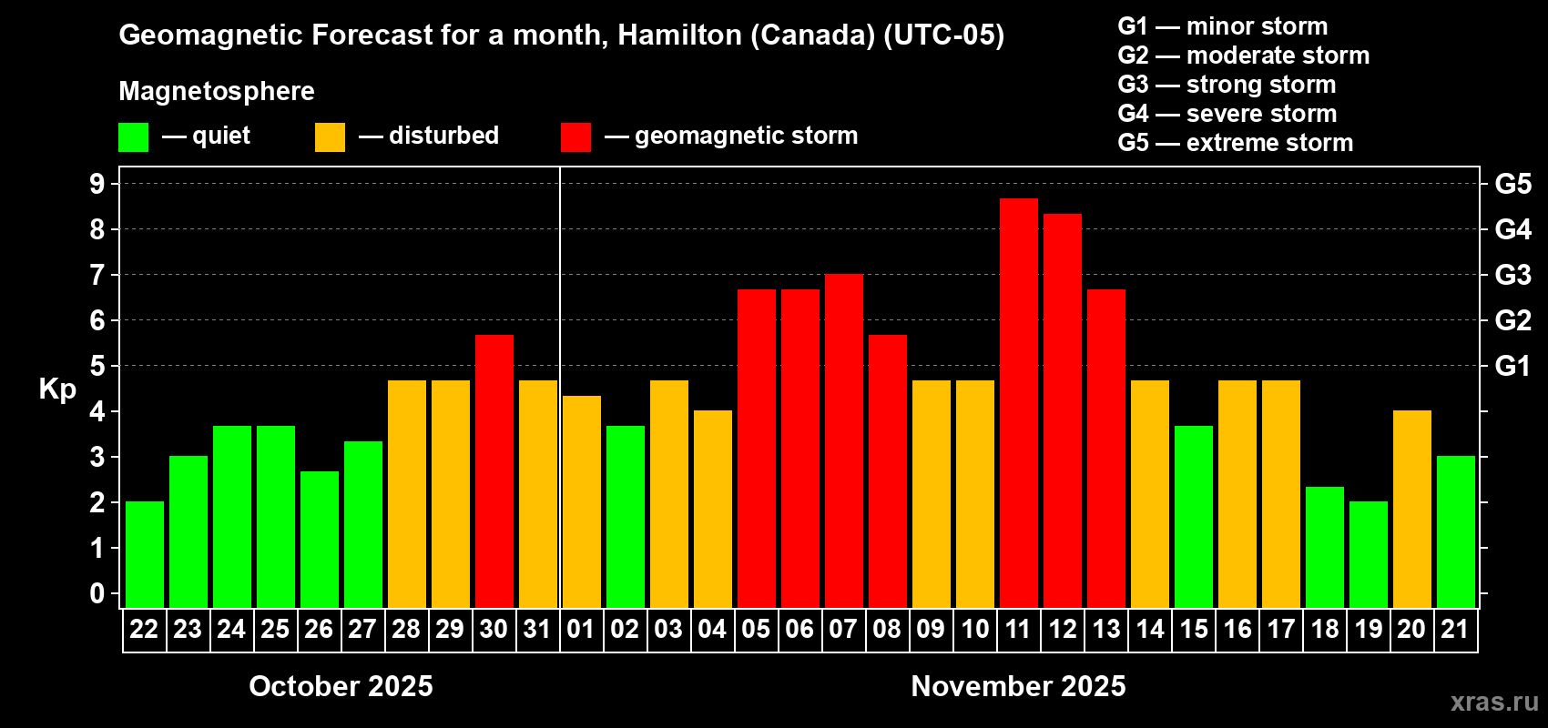 Geomagnetic storm forecast in Hamilton (Canada) for Oct 22, 2025