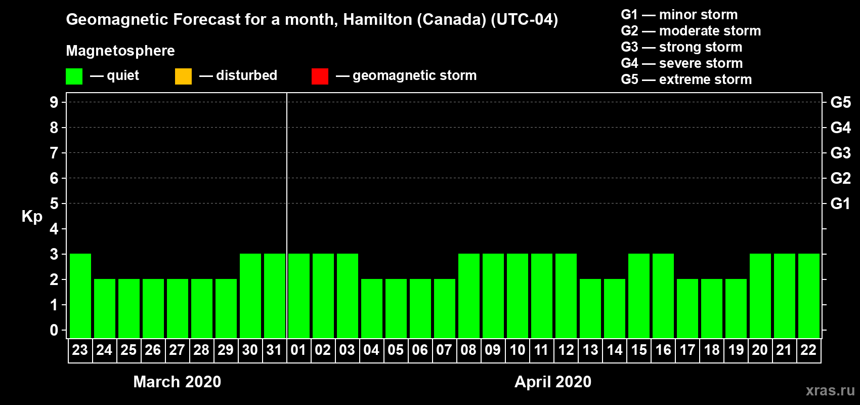 Geomagnetic activity forecast in Hamilton (Canada) — Mar 23, 2020