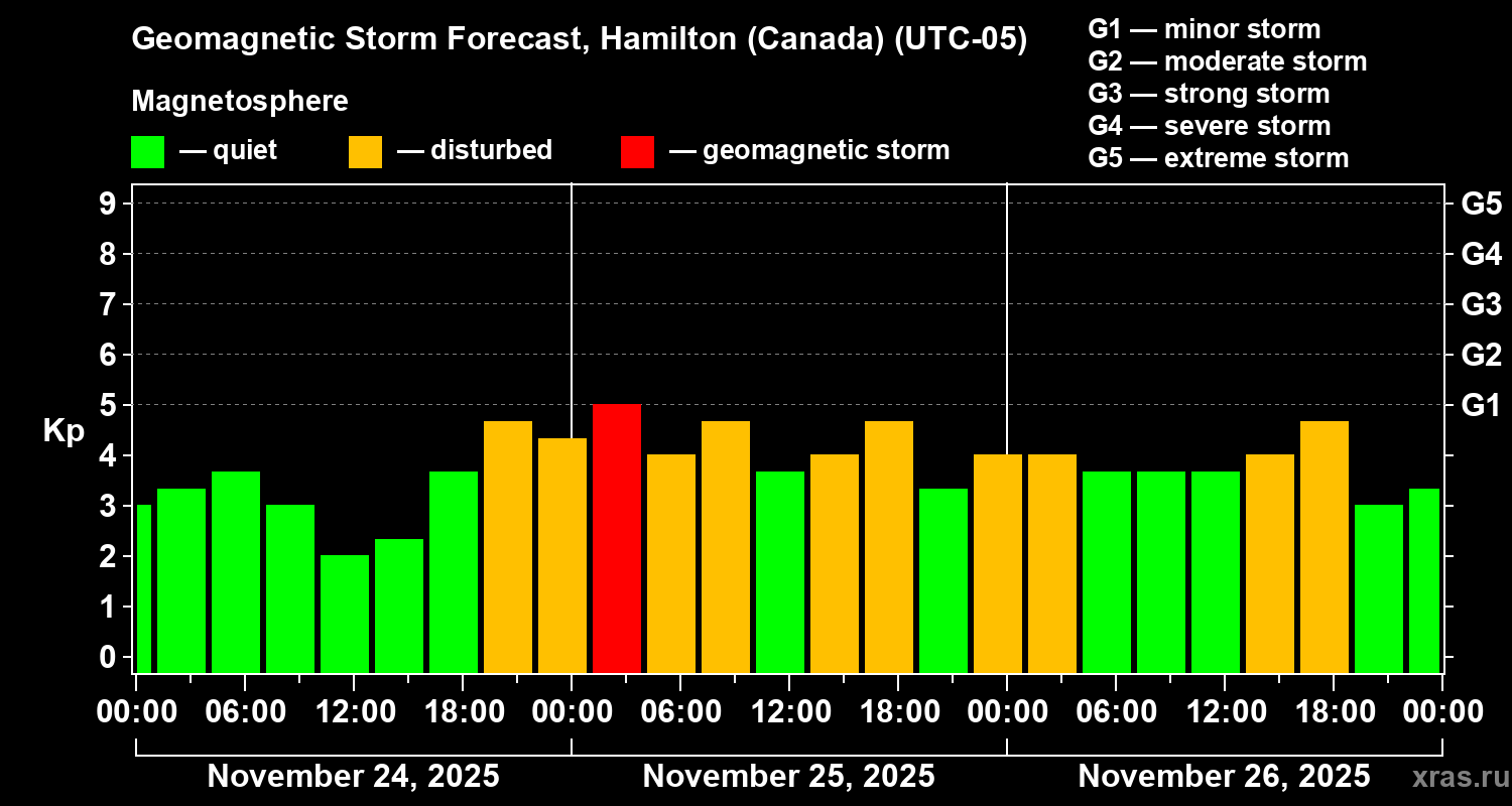 Geomagnetic storm forecast in Hamilton (Canada) for Nov 24, 2025