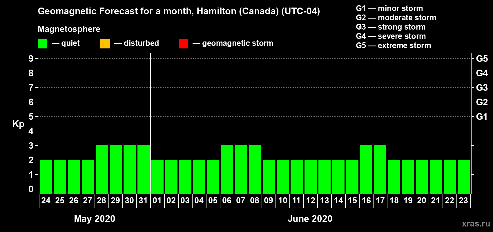 Geomagnetic storm forecast in Hamilton (Canada) for May 24, 2020