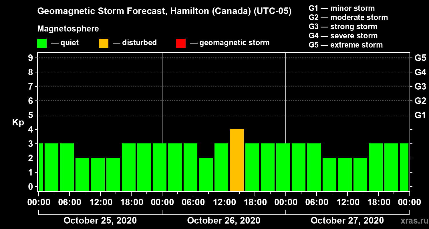 Geomagnetic storm forecast in Hamilton (Canada) for Oct 25, 2020