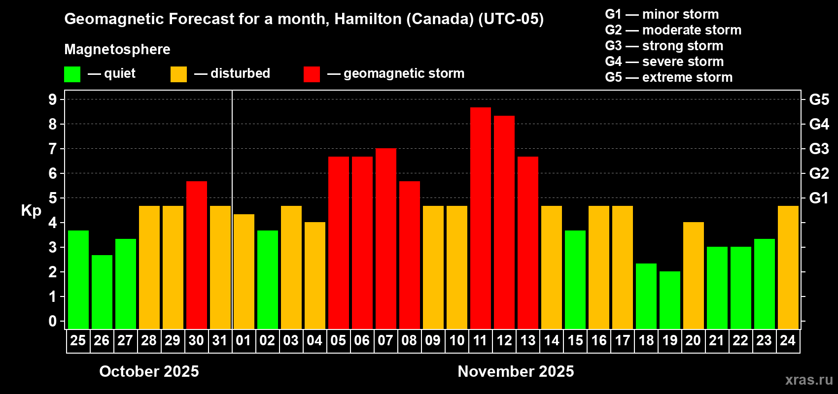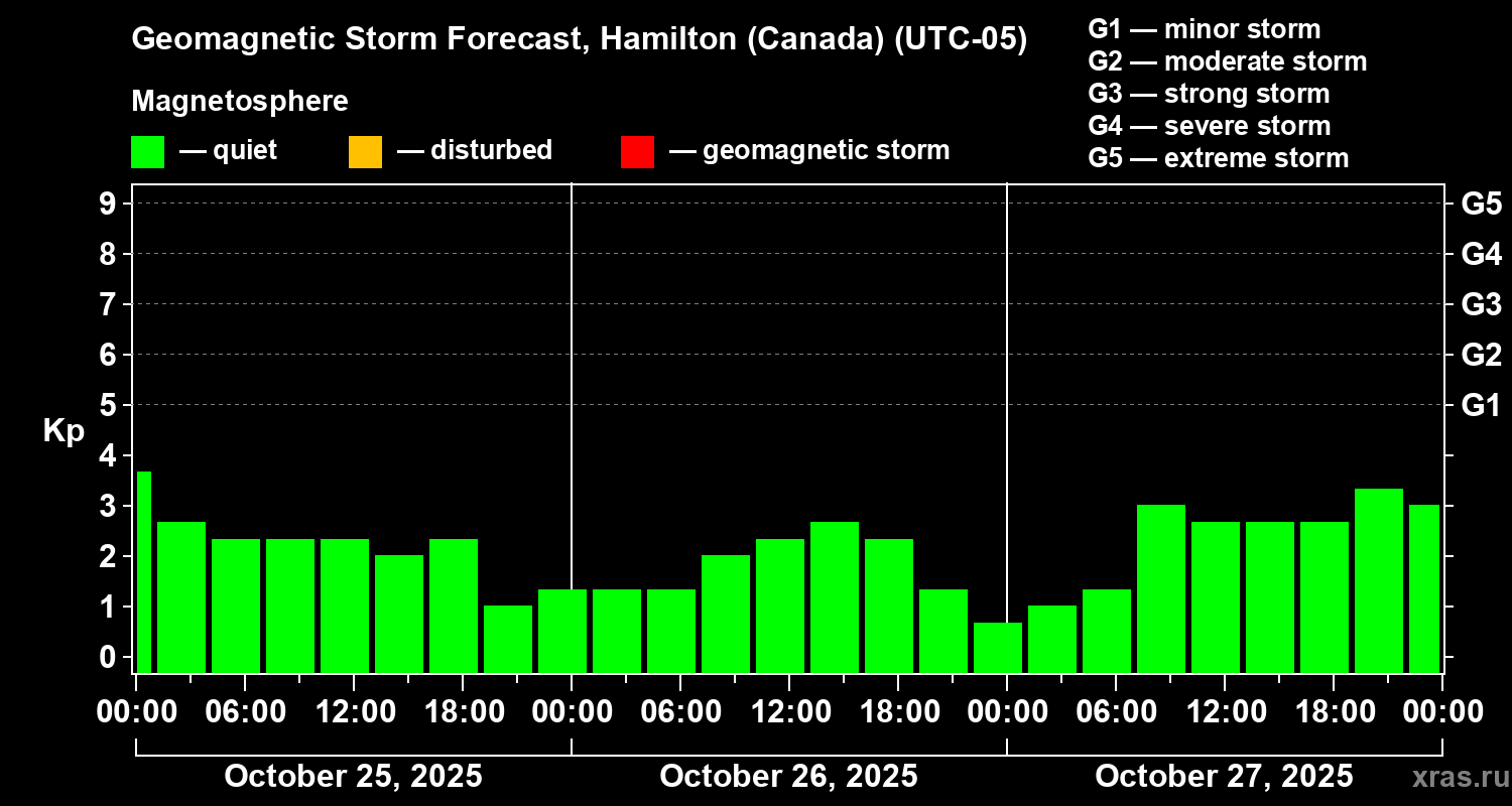 Geomagnetic storm forecast in Hamilton (Canada) for Oct 25, 2025