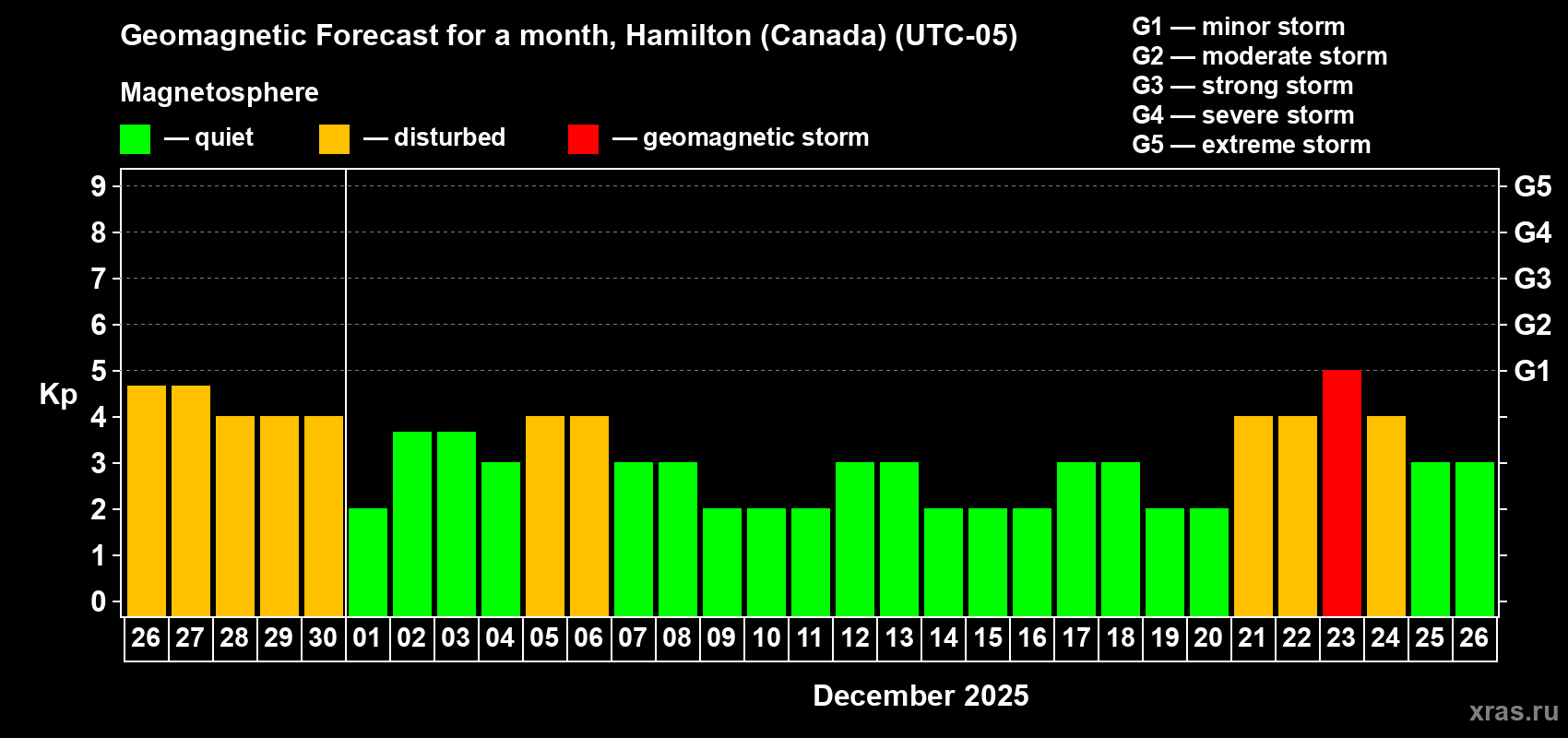 Geomagnetic storm forecast in Hamilton (Canada) for Nov 26, 2025