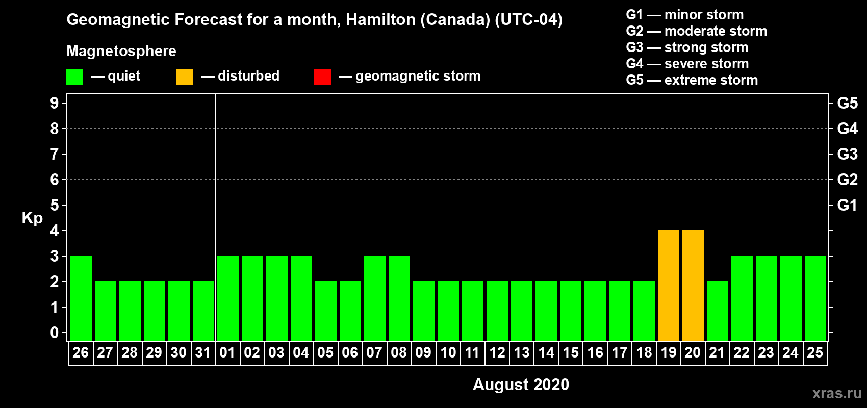 Geomagnetic storm forecast in Hamilton (Canada) for Jul 26, 2020
