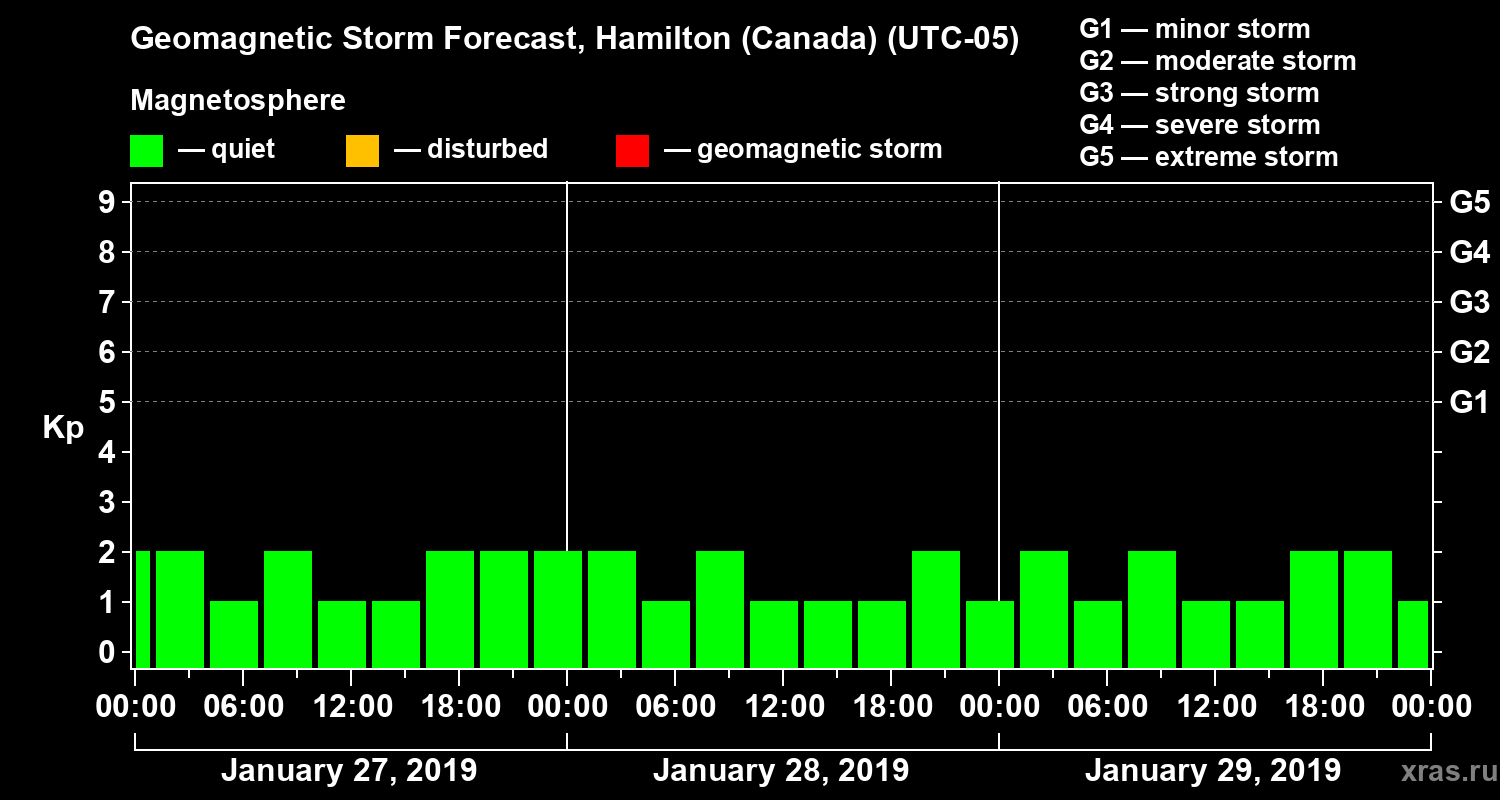 Geomagnetic storm forecast in Hamilton (Canada) for Jan 27, 2019