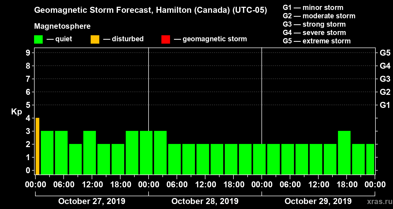 Geomagnetic storm forecast in Hamilton (Canada) for Oct 27, 2019