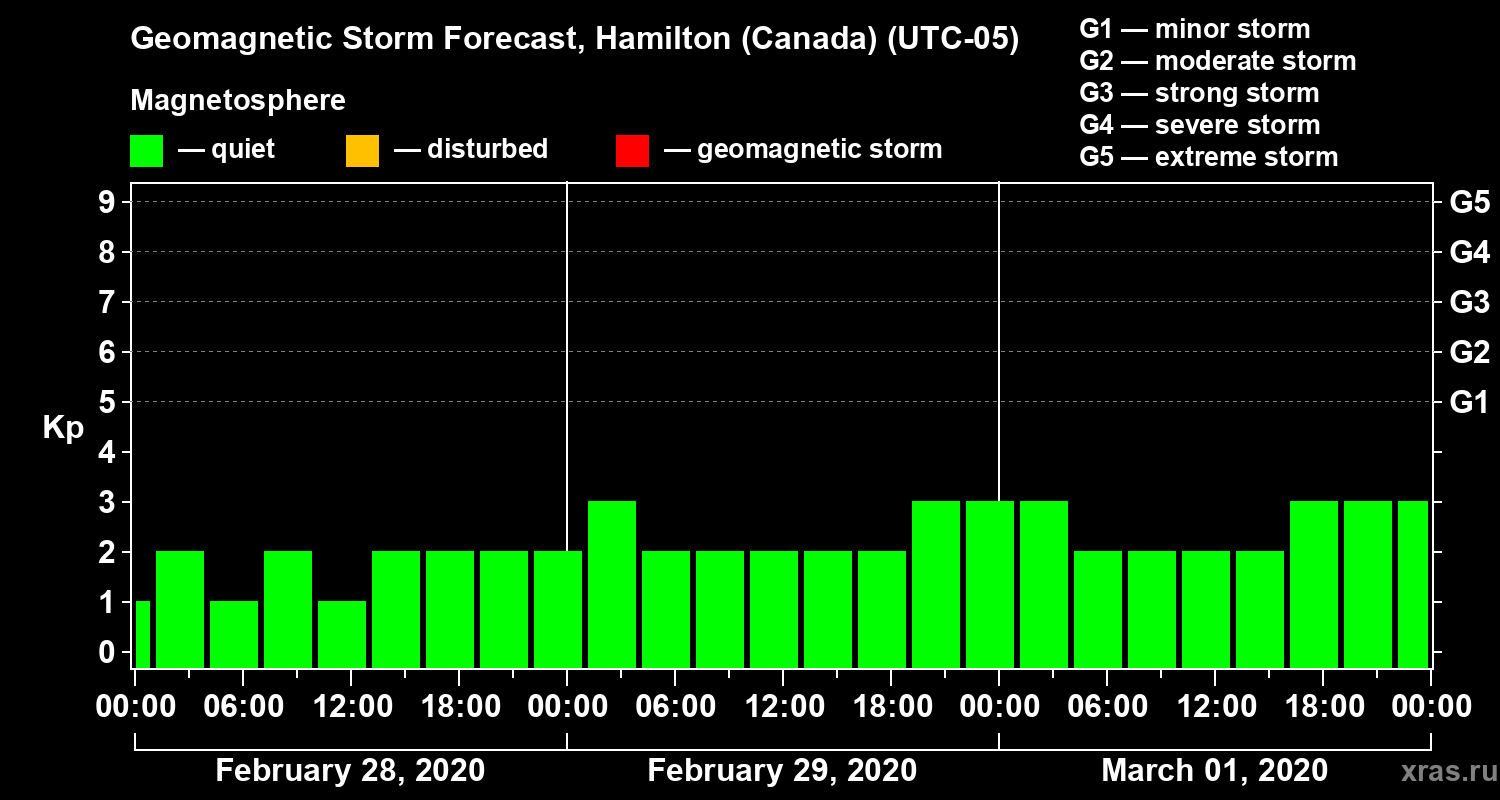 Geomagnetic activity forecast in Hamilton (Canada) — Feb 28, 2020