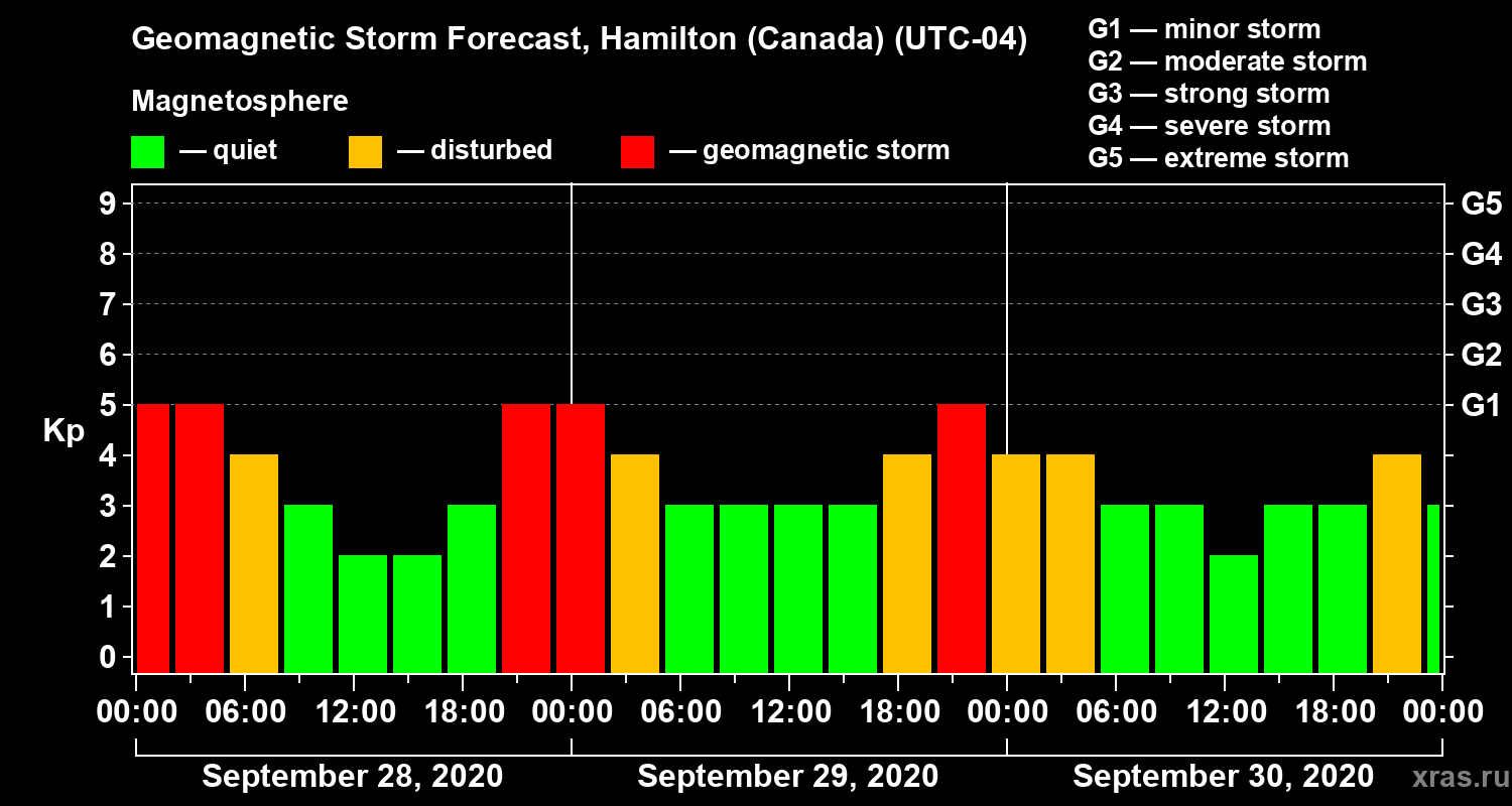 Geomagnetic storm forecast in Hamilton (Canada) for Sep 28, 2020