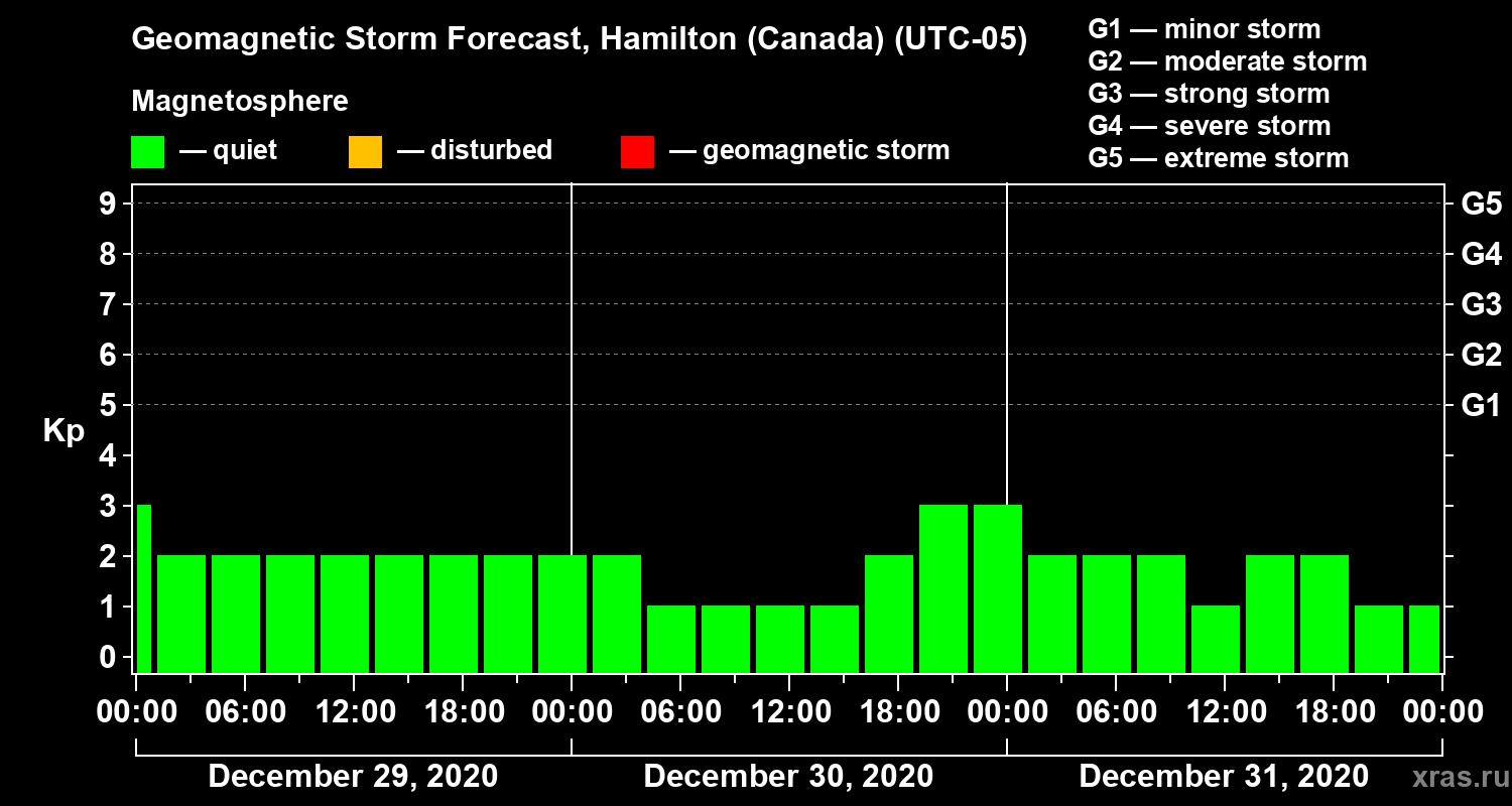 Geomagnetic storm forecast in Hamilton (Canada) for Dec 29, 2020