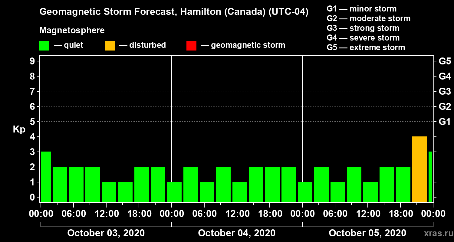 Geomagnetic storm forecast in Hamilton (Canada) for Oct 03, 2020