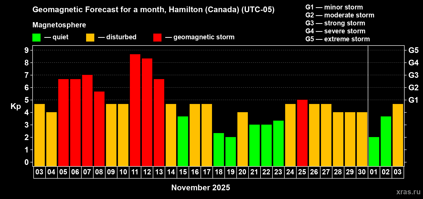 Geomagnetic storm forecast in Hamilton (Canada) for Nov 03, 2025