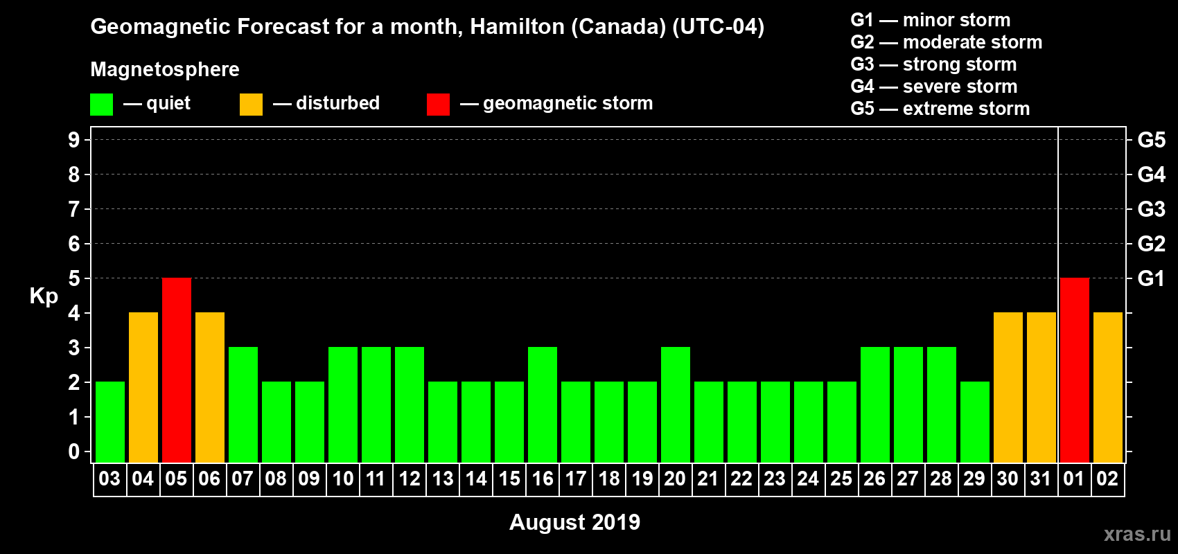 Geomagnetic storm forecast in Hamilton (Canada) for Aug 03, 2019