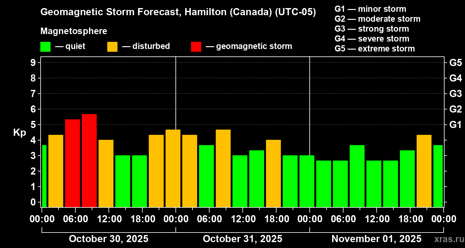 Geomagnetic storm forecast in Hamilton (Canada) for Oct 30, 2025
