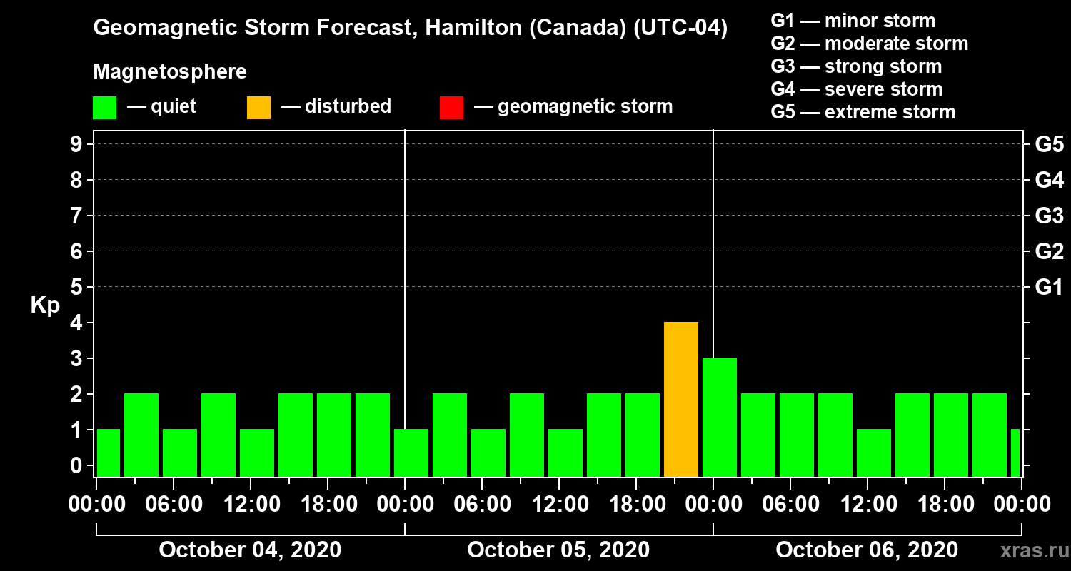 Geomagnetic storm forecast in Hamilton (Canada) for Oct 04, 2020