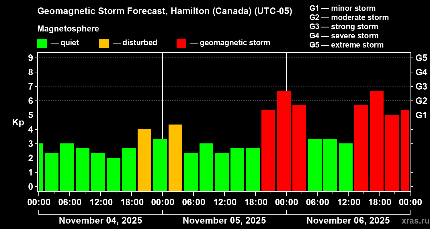 Geomagnetic storm forecast in Hamilton (Canada) for Nov 04, 2025