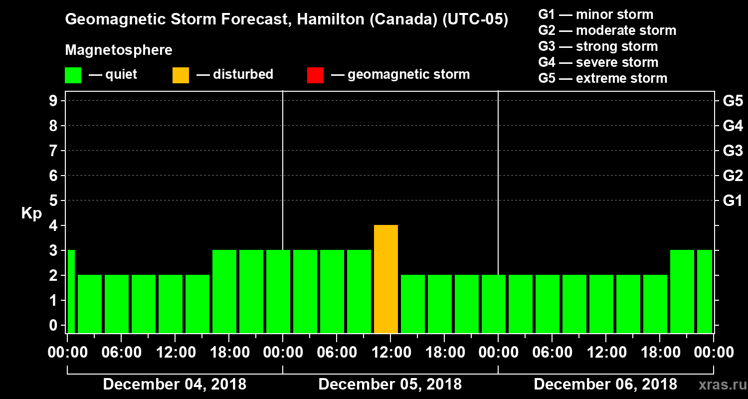 Geomagnetic storm forecast in Hamilton (Canada) for Dec 04, 2018