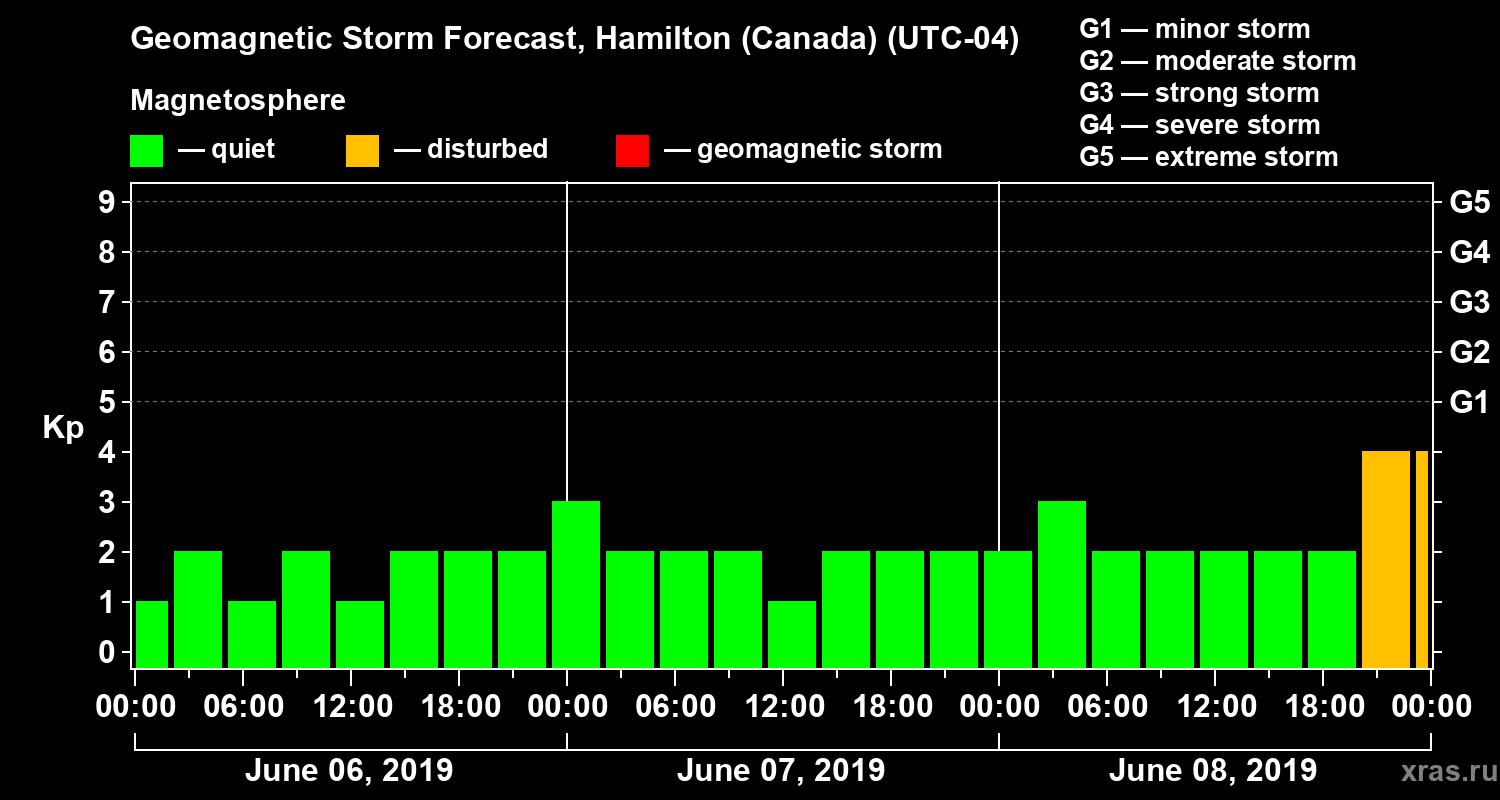 Geomagnetic storm forecast in Hamilton (Canada) for Jun 06, 2019