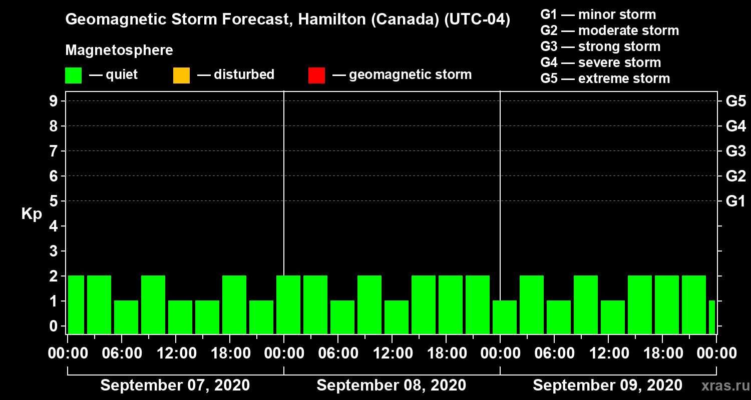 Geomagnetic storm forecast in Hamilton (Canada) for Sep 07, 2020