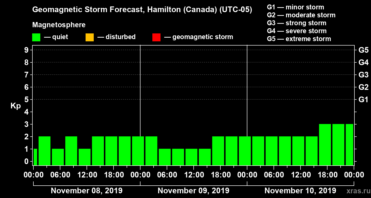 Geomagnetic storm forecast in Hamilton (Canada) for Nov 08, 2019