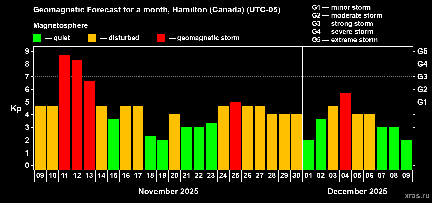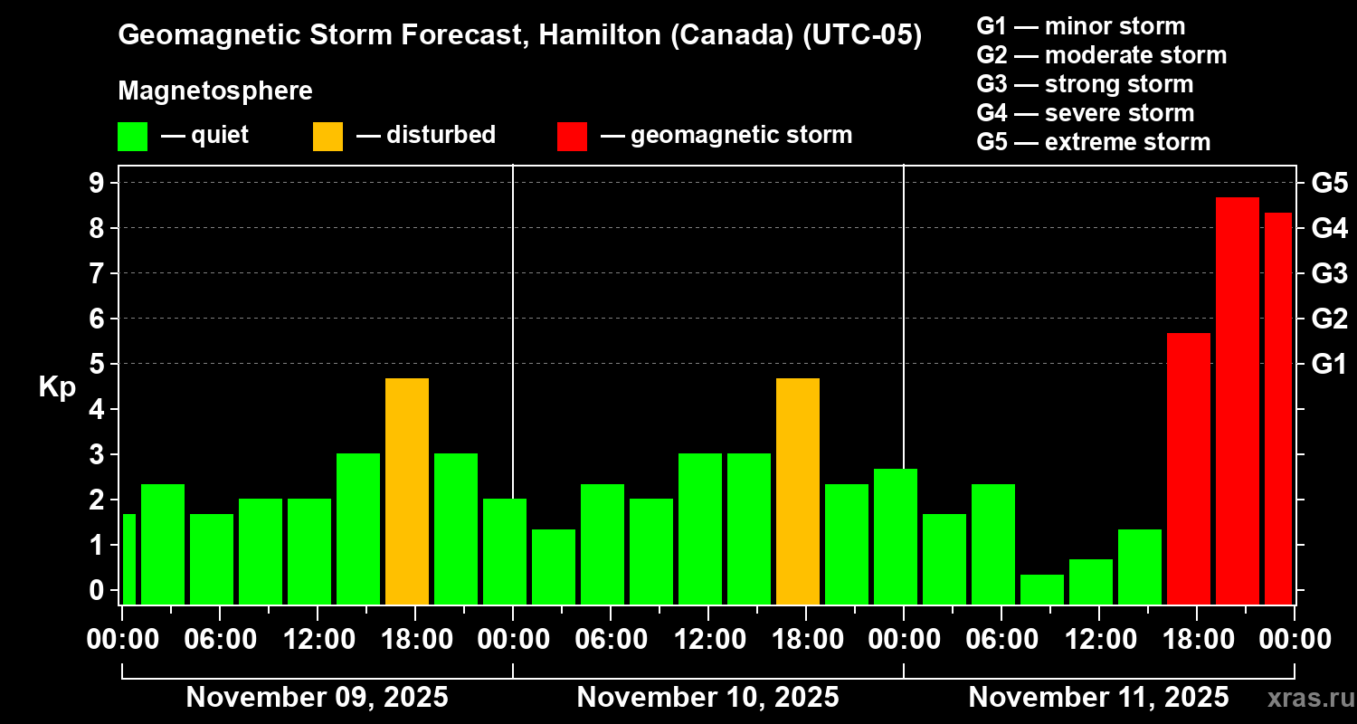 Geomagnetic storm forecast in Hamilton (Canada) for Nov 09, 2025