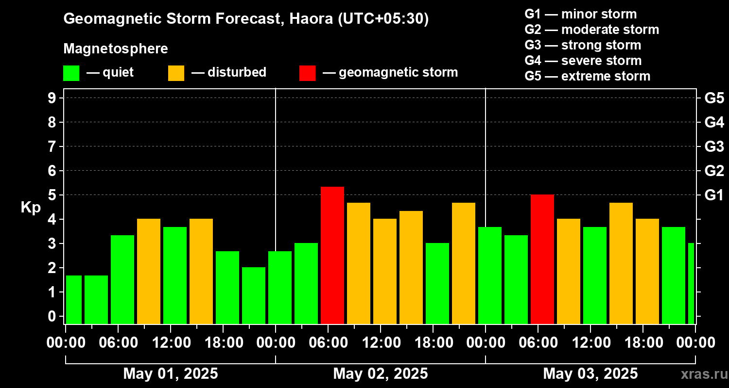 Geomagnetic storm forecast in Haora for May 01, 2025
