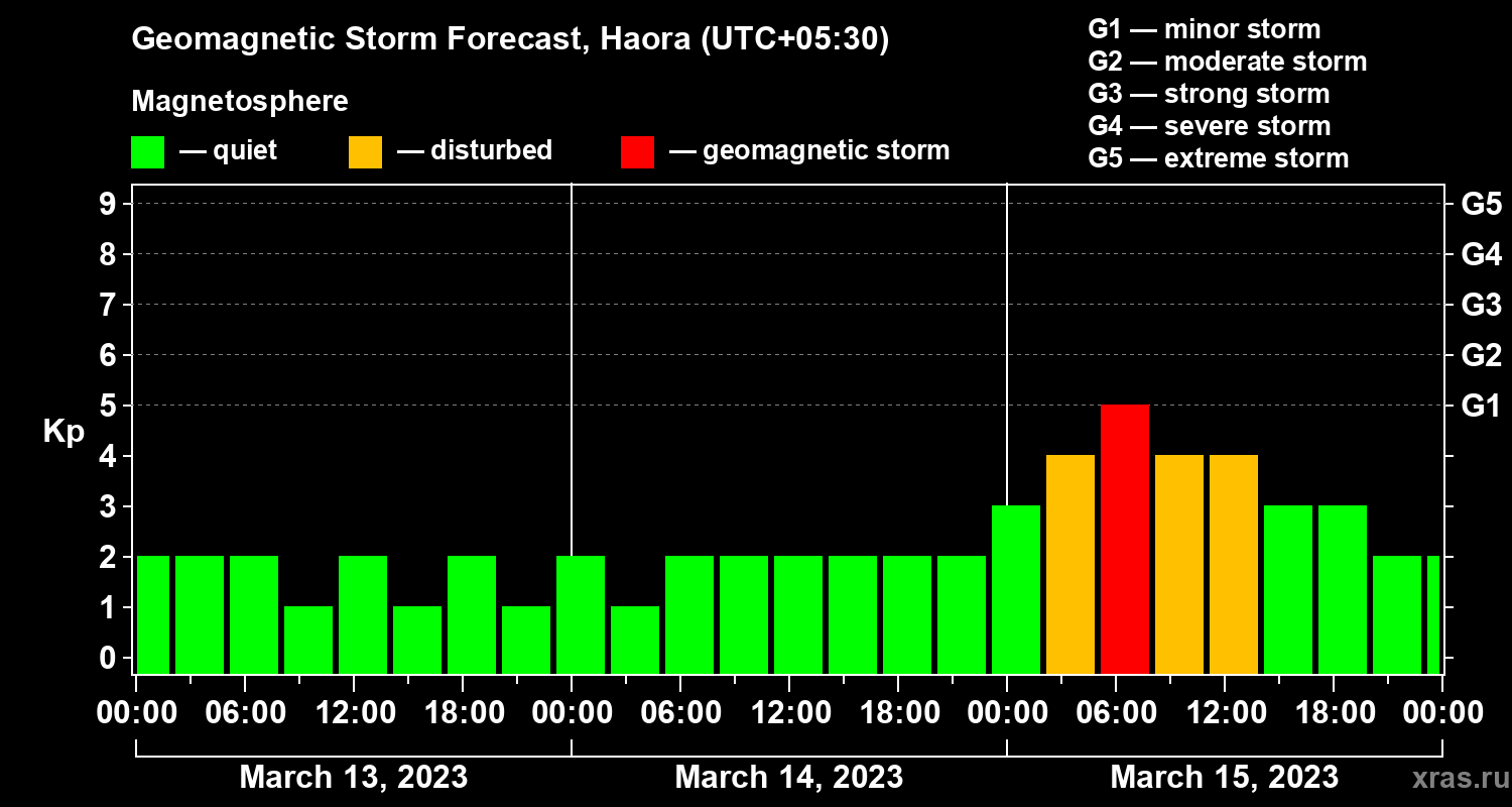 Geomagnetic storm forecast in Haora for Mar 13, 2023