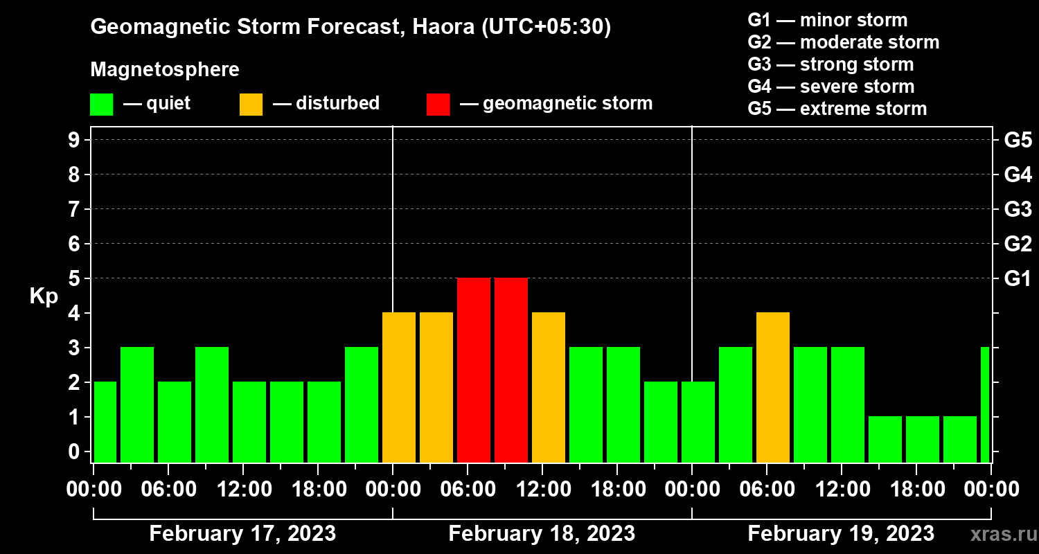 Geomagnetic storm forecast in Haora for Feb 17, 2023