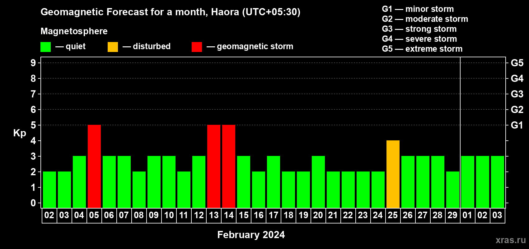 Geomagnetic storm forecast in Haora for Feb 02, 2024