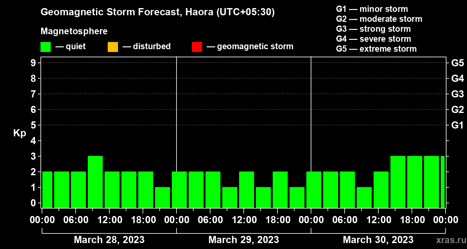 Geomagnetic storm forecast in Haora for Mar 28, 2023